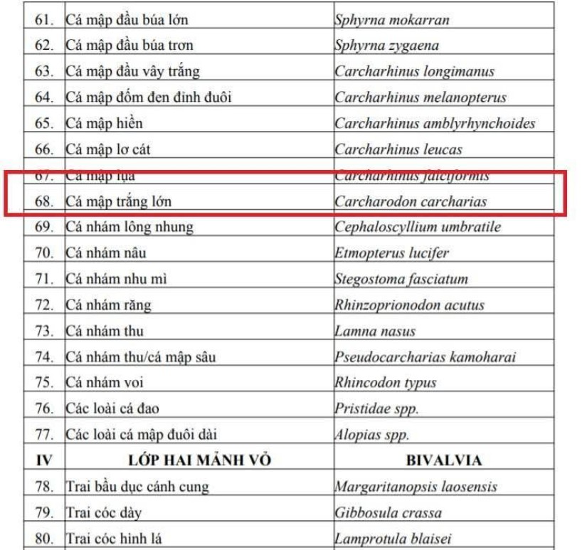 Trong Sách Đỏ Việt Nam, cá mập trắng cũng được liệt kê là loài cần được bảo vệ nghiêm ngặt, do nguy cơ tuyệt chủng và giá trị sinh học đặc biệt.