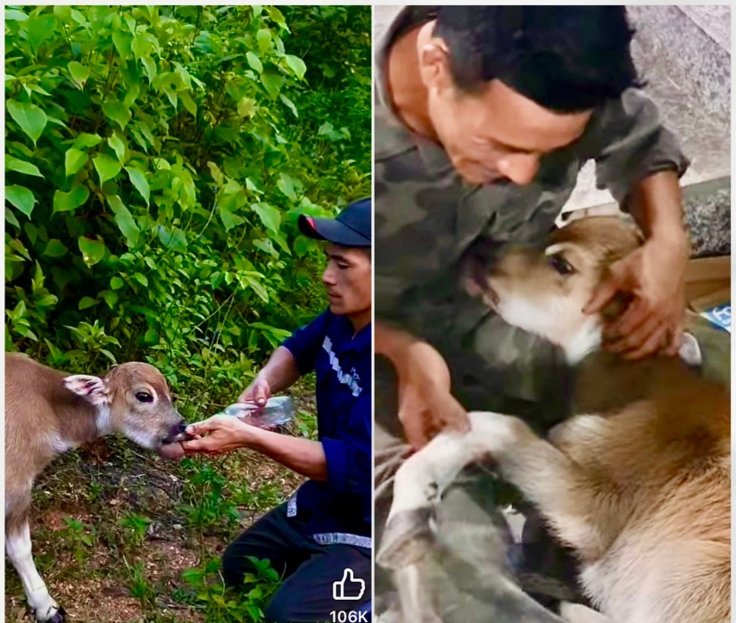 “Con nghé cứ nhìn chúng tôi bằng đôi mắt cầu cứu. Khi chồng tôi ngồi xuống cho uống nước pha chút đường, nó khẽ đặt đầu lên đầu gối như muốn xin được che chở,” chị Thắng kể.
