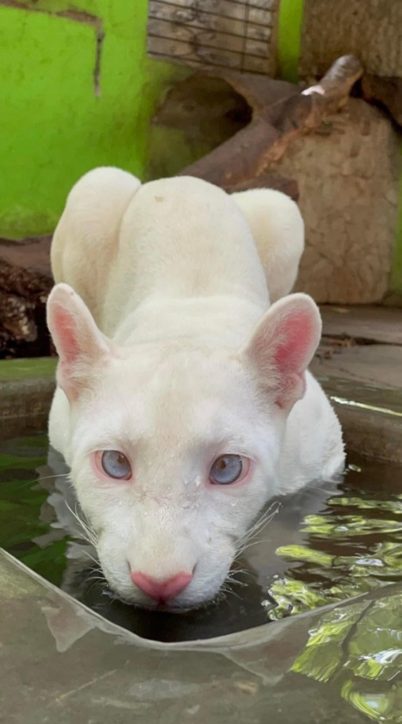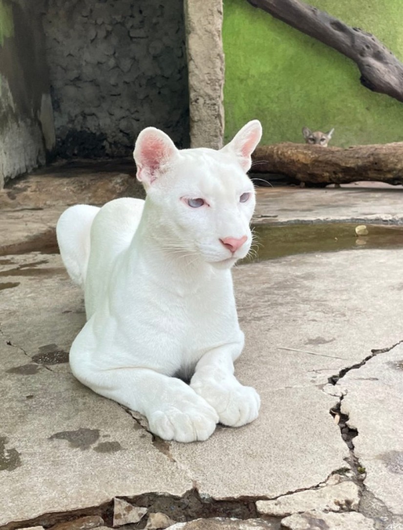 Itzae sở hữu bộ lông trắng tuyệt đối, đôi mắt màu nhạt và sắc diện mờ ảo – những dấu hiệu đặc trưng của chứng bạch tạng (albinism). Trong tiếng Maya, tên gọi Itzae mang nghĩa “Món quà của Chúa” – cách mà các nhân viên vườn thú muốn nói về sự hiếm hoi và đặc biệt của chú puma con này.